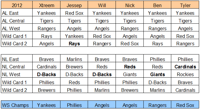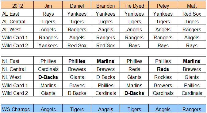 I ended up selecting the Rays, Tigers and Rangers as division winners in the American League with the Angels and Red Sox earning the two Wild Card spots.