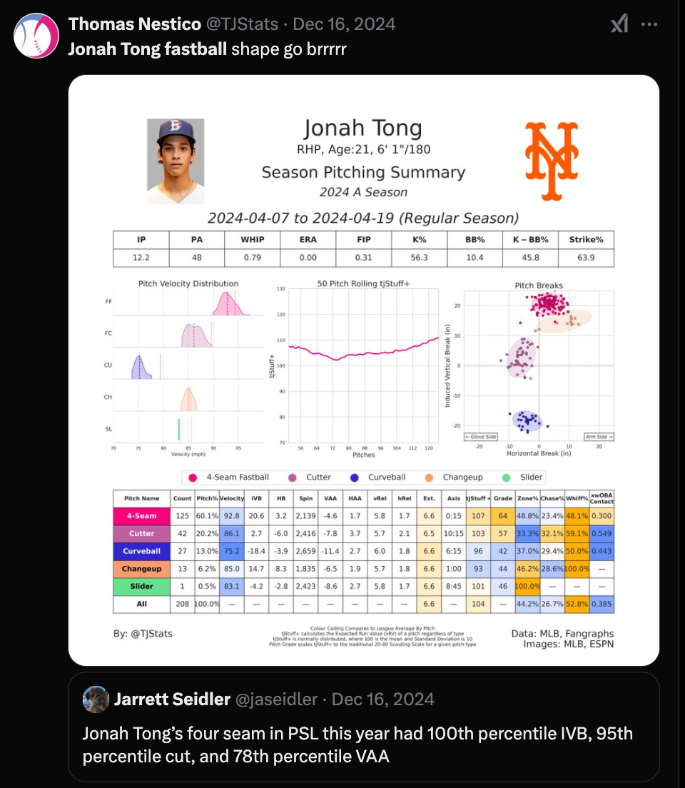 After being limited to 21 innings in 2023, Tong got off to a fast start in 2024. In his first five appearances, Tong struck out 43 batters while allowing just two unearned runs—none earned!—over 23.2 innings. Over three levels in ’24, Tong tossed 113 innings with a 3.03 ERA. Among 313 minor league pitchers with a minimum of 100 innings pitched, Tong posted the sixth-highest strikeout rate (34.2 percent) and second-lowest fielding independent pitching (2.33).