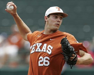 While there are a couple of college arms that have gotten a bit more buzz as being top-of-the-draft types, there may not be another pitcher in the country who’s been more consistently effective than the Texas Longhorns ace. The big right-hander with a Mike Pelfrey-type frame has three plus pitches and shows the ability to maintain his stuff deep into every start. His fastball has been around 91-97 mph, even touching 98 mph, and sits comfortably in the 93-95 mph. His fastball has plus movement as well. His curve, with a hard, tight 11-to-5 break, is also a plus pitch, as is his changeup. While his command is average — he occasionally gets too much of the middle of the plate — he’s got outstanding control, throwing strikes and not hurting himself with walks.  – Jonathan Mayo, MLB.com