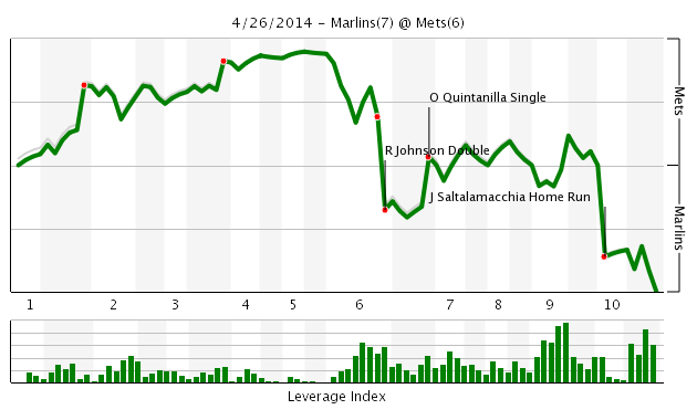 For a moment, after a two-out, two-run single by Lucas Duda, the Mets had a 5-1 lead, Jenrry Mejia was pitching lights out, and it felt like this 13-10 start in the standings was gaining more momentum each night. If you are a Mets fan, like me, you were probably texting or phoning anyone who would listen about the ground ball machine that is Mejia and about these Mets who somehow keep winning despite a lineup that includes the ageing (or ageless) Bobby Abreu. There was some giddiness among Mets fans early in the game tonight. Deservingly so, with a 5-1 lead and a win probability based on similar score and inning context at 94%.