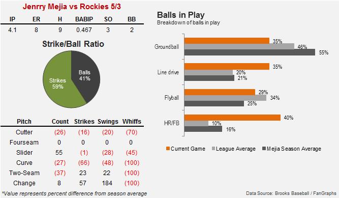 In order to provide a better breakdown of the starter’s performance, the graphic below shows Mejia’s outing tonight in context of his season and overall league averages.