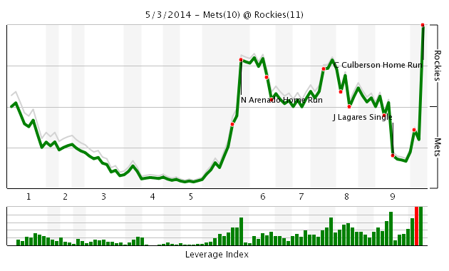 Since it is Coors Field, no lead is safe, even for the home team. The Mets would fight back with two runs to tie the game in the sixth inning. Chris Young and Curtis Granderson providing the big hits.