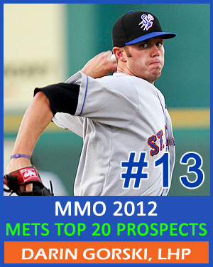We are back once again for another installment of the 2012 MMO Top 20 Mets Prospect list, featuring the number 13 prospect, LHP Darin Gorski. The Mets selected Gorski in the 7th round of the 2009 amateur draft out of Kutztown University (PA). At the time, they drafted a 21-year-old, 6’4″ left-hander, who needed to build strength and stamina, clean up his mechanics, work on his fastball command, iron out his breaking ball, and develop a change-up. Plenty of hard work, and three minor league seasons later and Gorski has elevated his game from a pool of anonymity to center stage, culminating when he was recently named the winner of the 2011 Mets Minor League Pitcher of the Year Award.