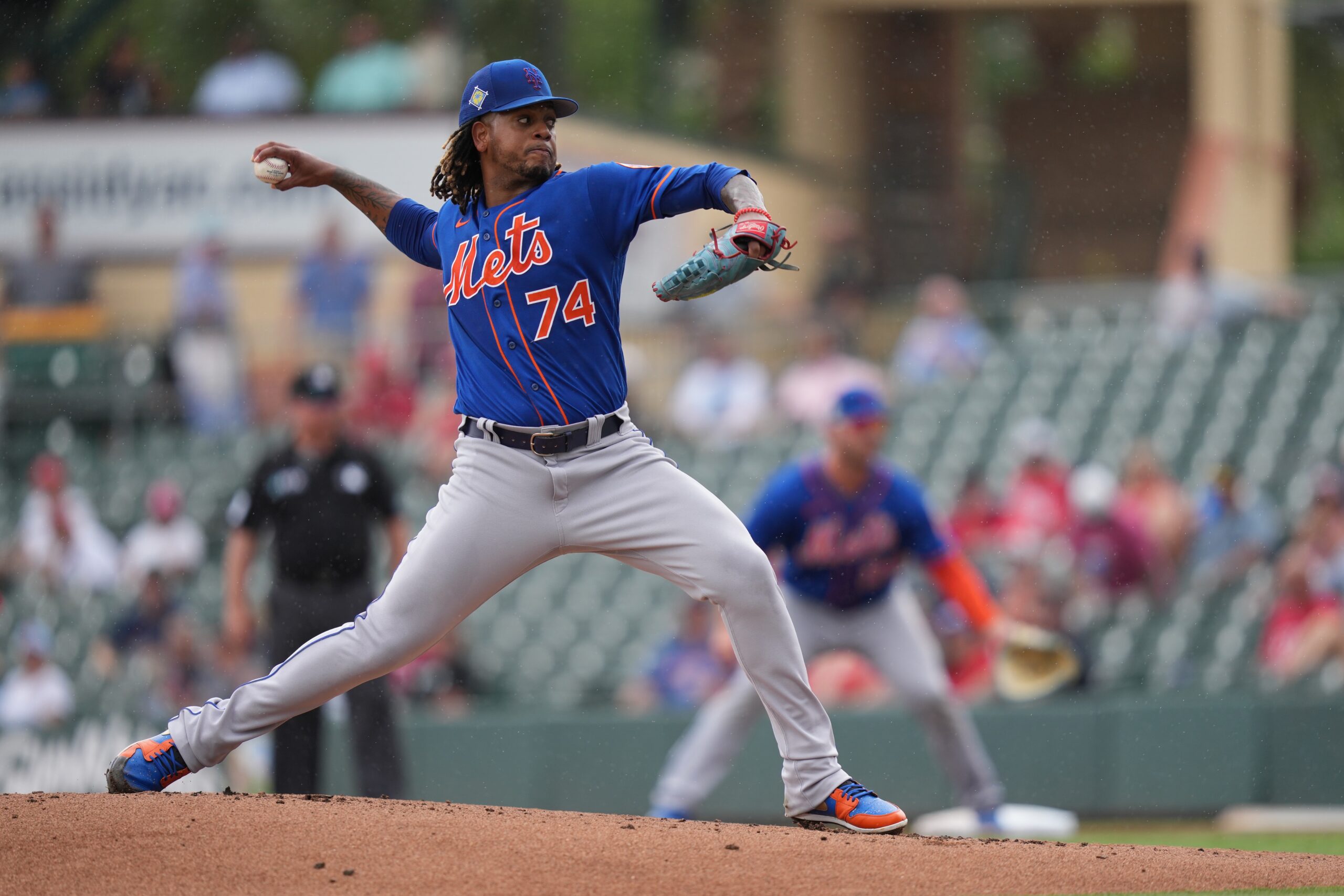 Apr 1, 2022; Jupiter, Florida, USA; New York Mets starting pitcher Felix Pena (74) delivers a pitch in the first inning of the spring training game against the St. Louis Cardinals at Roger Dean Stadium. Mandatory Credit: Jasen Vinlove-USA TODAY Sports