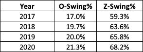 If we continue looking at the last four seasons in particular (since 2017), his 78.9% contact rate from this past year is a single-season career high. There was a slight bump in contact within the strike zone (83.6% to 84.8%), but most of the difference came from making contact outside the zone (52.1% to 65.0%). More on that in a bit, though.
