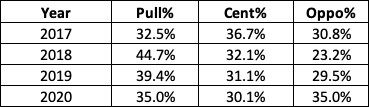 There has appeared to be a continued effort in using the whole field more, and there’s a clear trend going on in the below table — especially since 2018.