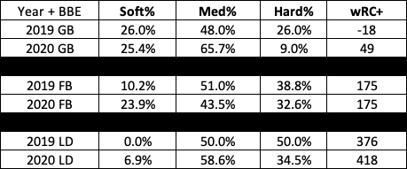 Here’s a look at how Nimmo’s quality of contact and results for grounders, fly balls, and liners differ between 2019 and 2020.