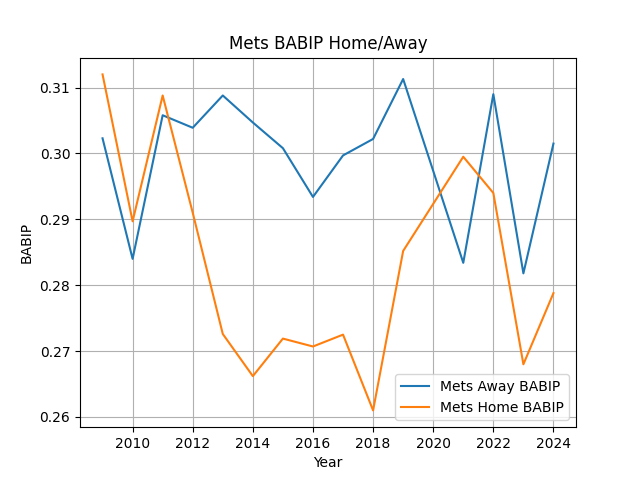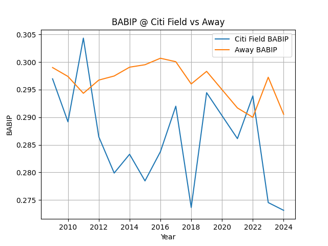 Using the PyBaseball Python API, I calculated the Mets’ BABIP for the last 15 seasons, comparing their BABIP while playing at Citi Field and away. 2020 is excluded. The code can be found here, and yes, it is in Polars. If you know, you know. The Sickos Know.