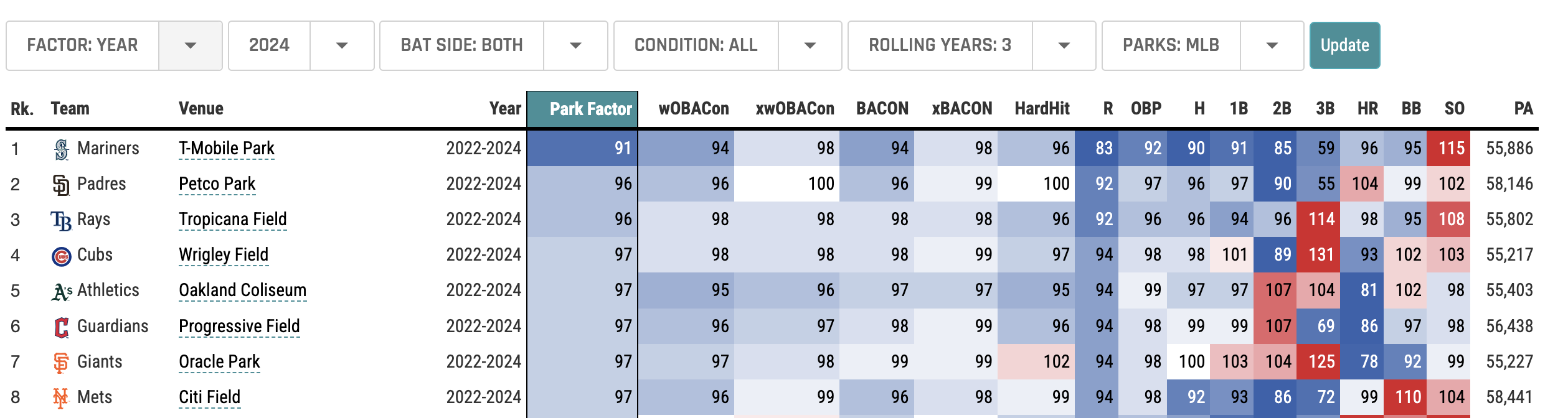 Below are the rolling Park Factors across all MLB stadiums for the last three seasons. 100 is the average; anything above 100 indicates a bias against hitters, and conversely, for hurlers.