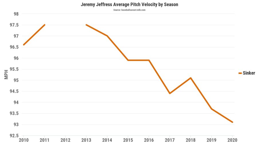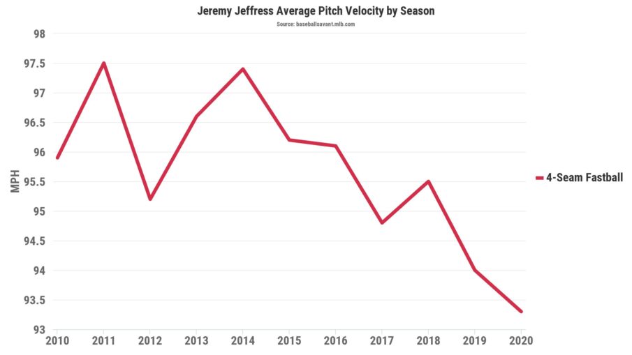 Similar to his sinker, Jeffress’ fastball has also endured a gradual decline involving its velocity since 2019, as it averaged 95.5 mph in 2018 and dropped down to just 93.3 mph last season. Even though his heater touched 94 mph at times in 2020, it failed to sustain that speed over an extended period of time and also never hit 95 mph on the radar gun.