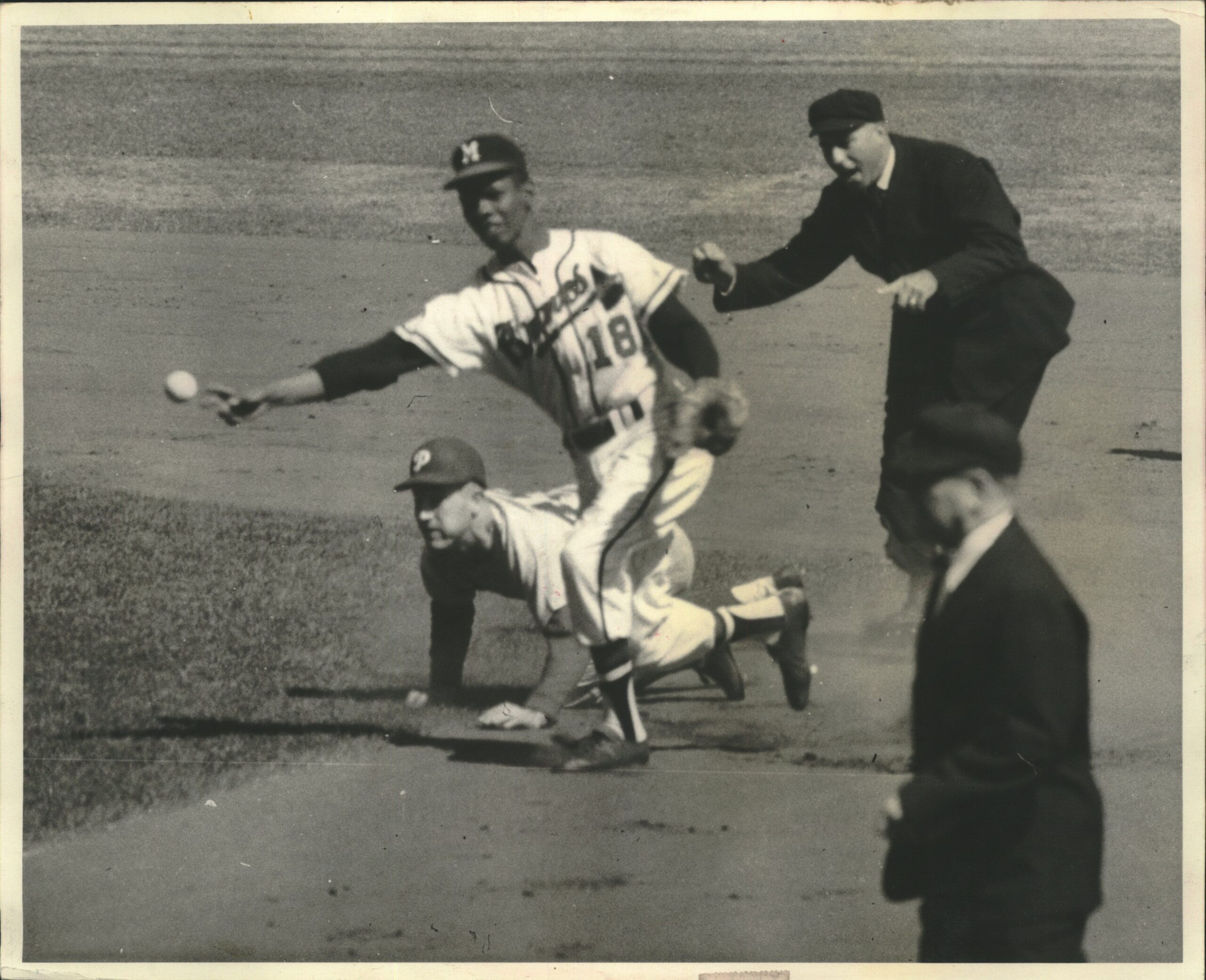 Braves second baseman Felix Mantilla (18) relays the ball to first after tagging out George Anderson of the Phillies in 1959.