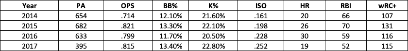 His three-and-a-half years with the organization featured a little bit of a roller coaster ride from an overall fWAR output (1.2, 5.3, 3.1, 2.3). When looking at everything being equal, though, that was more because of his defensive production than anything else.