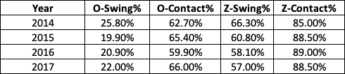 This was aided by the plate approach he brought to the park every single night. Although Granderson’s swing rate ended up dipping down to career-low levels by the time his tenure in Flushing was complete, he made the most of his contact. Here’s a look at how his chase rate (O-Swing%), swing rate on strikes (Z-Swing%), and the corresponding contact rates evolved from year to year.