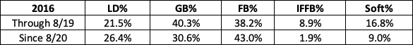 All of the classic signs of elite production lie in these numbers, most notably the 10-percentage-point drop in ground balls and an almost equal drop in infield flies. And while his hard-hit rate didn’t have as dramatic of a jump one would assume, he cut down significantly on soft contact.