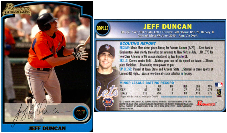 Duncan, a center fielder by trade out of Arizona State University, debuted with the Mets in 2003, and appeared in 56 games for them that year.