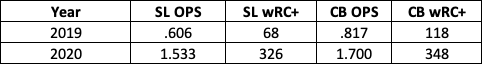 The sample sizes are small, but check out how his OPS and wRC+ against sliders and curveballs have changed between 2019 and 2020.