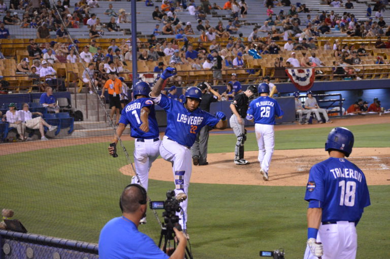 After being within one, Vegas was now behind by 5-2. In the bottom of the seventh, the offense got some help with back-to-back walks to left fielder Phillip Evans and third baseman Jio Mier. Pinch-hitter Cody Decker singled to load the bases. After El Paso made a pitching change, second baseman Gavin Cecchini singled to score Evans and everyone moved up. Rosario grounded out as Mier was forced at home. The bases now loaded with one out, Smith singled to right driving in two to tie the game at 5-5. Catcher Kevin Plawecki singled to plate Rosario with the go ahead run. Centerfielder Travis Taijeron walked to re-load the bases. Then with two outs, Evans came up for the second time in the inning and singled in two more runs to increase the Vegas lead to 8-5.