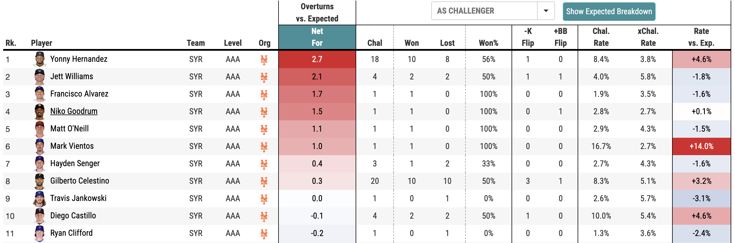 Veteran journeymen Gilberto Celestino & Yonny Hernandez each led the Syracuse Mets with 10 overturned challenges, with Hernandez’s 56% successful challenge rate just eeking out Celeistin’s 50%. Hernandez led the club with +2.7 “Net For” challenges, which gives a player credit for overturns on pitches thrown in similar locations to other players.