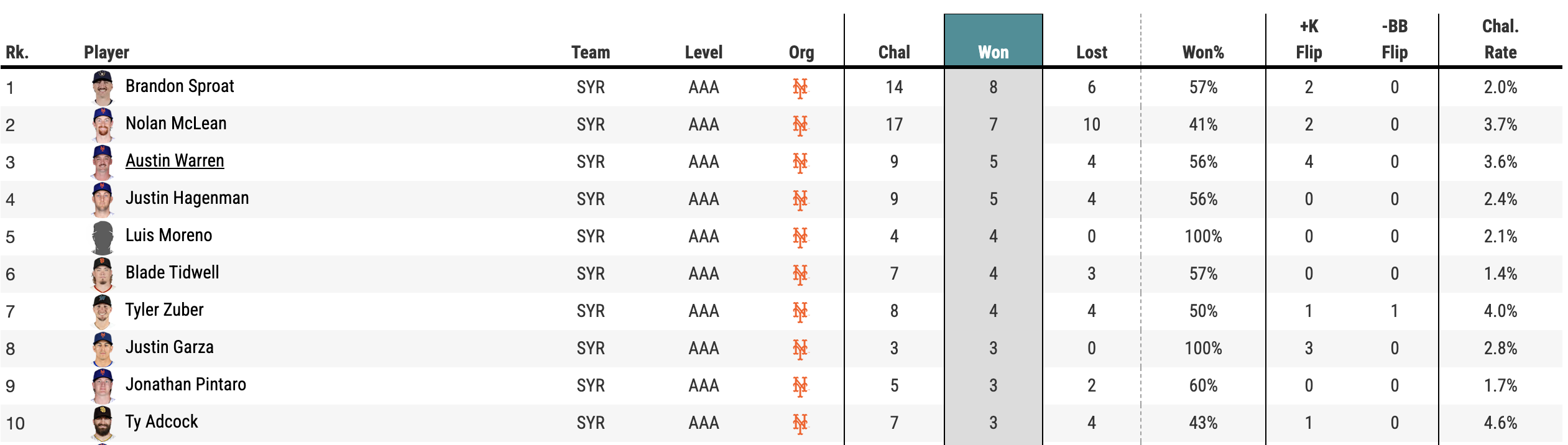 Overturning calls via ABS isn’t just an option for hitters; pitchers are able to utilize it to reverse egregious ball/strike counts. During his time leading the Mets’ AAA staff, Nolan McLean‘s pitches were challenged 17 times by the Mets, with seven overturned. His seven reversals ranked second among Mets’ pitchers, trailing only former Mets farmhand Brandon Sproat.