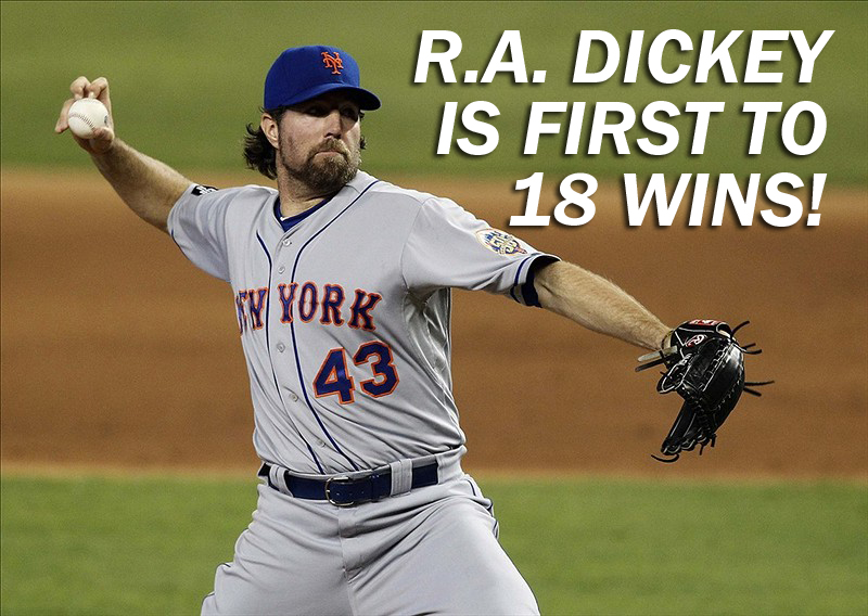 Dickey becomes the first Mets pitcher to reach 18 wins since Frank Viola (20-12) and Dwight Gooden (19-7) both accomplished the feat in 1990.