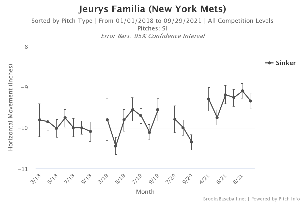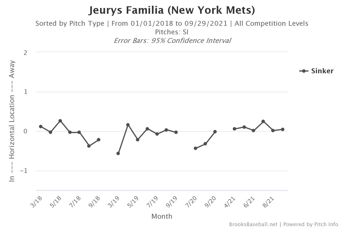 Familia has thrown four different pitches at least 30 times in 2021: his sinker, slider, four-seamer, and splitter. He’s allowed 10 dingers so far this year — one off his slider and nine (!) off his sinker. If you’re thinking that sounds like a lot for this particular pitch, that’s because you’re absolutely right.