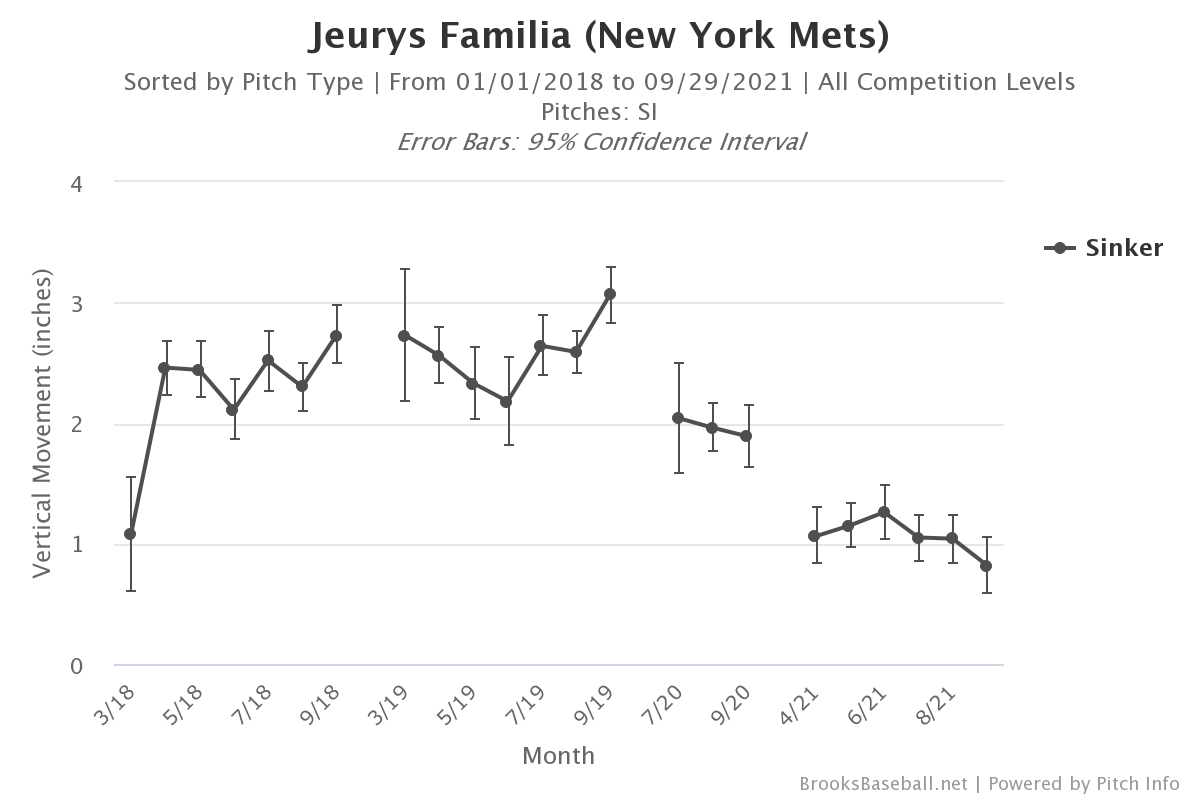 And, for good measure, here’s how the vertical movement of Familia’s sinker compares to previous seasons: