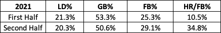 This issue has obviously put a damper on the overall effectiveness of this offering, as opposing hitters are slashing .283/.331/.543 against it. Despite producing his best walk rate (6.0%) and strikeout rate (19.3%) on his sinker since 2015 (5.8% walk rate, 20.9% strikeout rate), hitters have posted a 136 wRC+ when facing this pitch. The only time it’s been higher in that during a single (and full) season was in 2019, when it was 151.