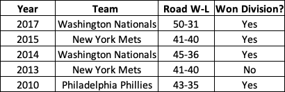 Since this stuck out to me so much, I decided to do some snooping on the interwebs. I checked out NL East team records in this situation each year going back to 2010 to see if there were any instances where nobody finished above .500 on the road for the season. While that hasn’t happened in the last 11 years, there have been five instances where just one team had a winning record as a visitor: