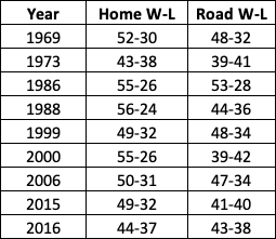 Does this mean much of anything? Maybe yes, maybe no (probably no). But it is interesting that so many of New York’s past playoff teams had a winning record on the road. It makes sense because one would imagine that to make a deep run in the postseason, a club needs to know how to take care of business away from home (although the ’73 and ’00 clubs both went to the World Series).