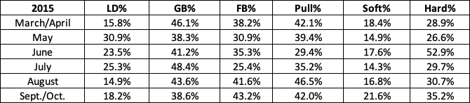 Here’s a look at how different areas of his batted-ball profile changed throughout 2015: