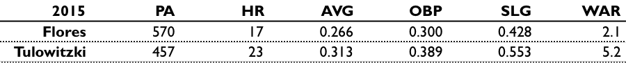 No surprise – Tulo is expected to have a considerably better season than Flores in ’15. How much better? Well, part of this analysis depends on how much value you place in current defensive metrics. ZiPS projects Tulo to be a good defender, with Flores negatively valued. We can squabble over how big that difference should be, but let’s keep with their valuation for now. The difference in win value projects to be 3.1 wins. A pretty significant gap.