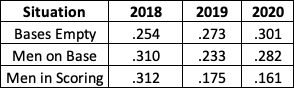 Once again, May is arriving with a solid three-year track record of success in this category, posting rates of 84.1%, 78.9%, and 80.0% since 2018. As a frame of reference, these percentages have been comfortably above the league average each year (73.1% in ’18, 72.8% in ’19, 71.5% in ’20). It’s also worth noting that wOBA from opposing hitters has progressively gotten worse as runners advance to scoring position the last couple years against May.