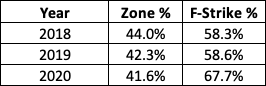 Although this can go hand-in-hand with walk rate, it’s still different, so here we are. Something I noticed while looking around at May’s stats — other than the perfectly symmetrical parts of his 2020 campaign — was that he’s consistently thrown a lower percentage of pitches in the strike zone, while getting a higher percentage of first-pitch strikes.