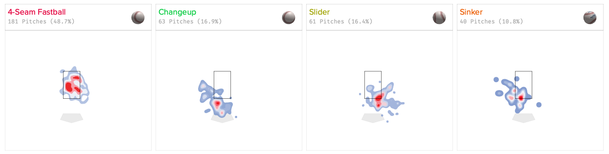 As you can see when watching Williams pitch, his game is based on locating his pitches correctly. He does a good job of avoiding the meat of the plate by mixing his four main pitches on the edges and corners of the zone. Williams works his four-seam fastball in different areas, but does a good job of keeping his changeup, slider, and sinker on distinct parts of home plate.