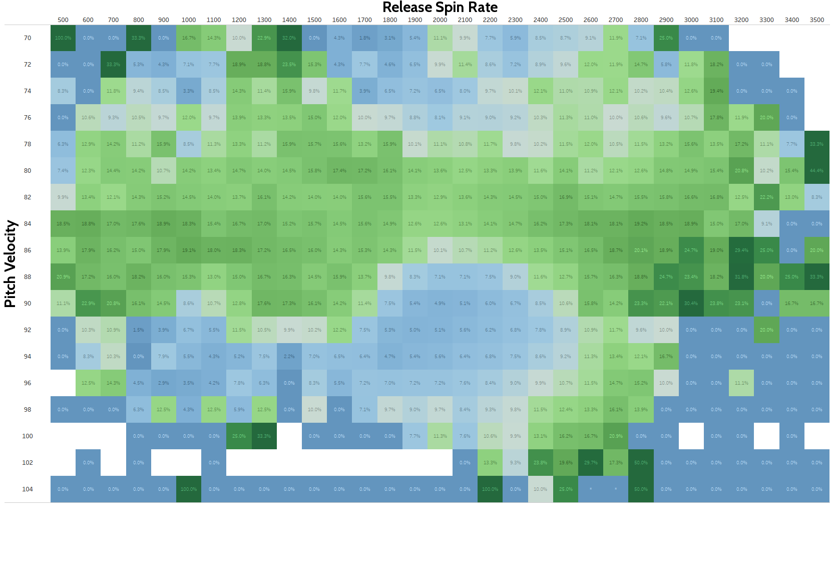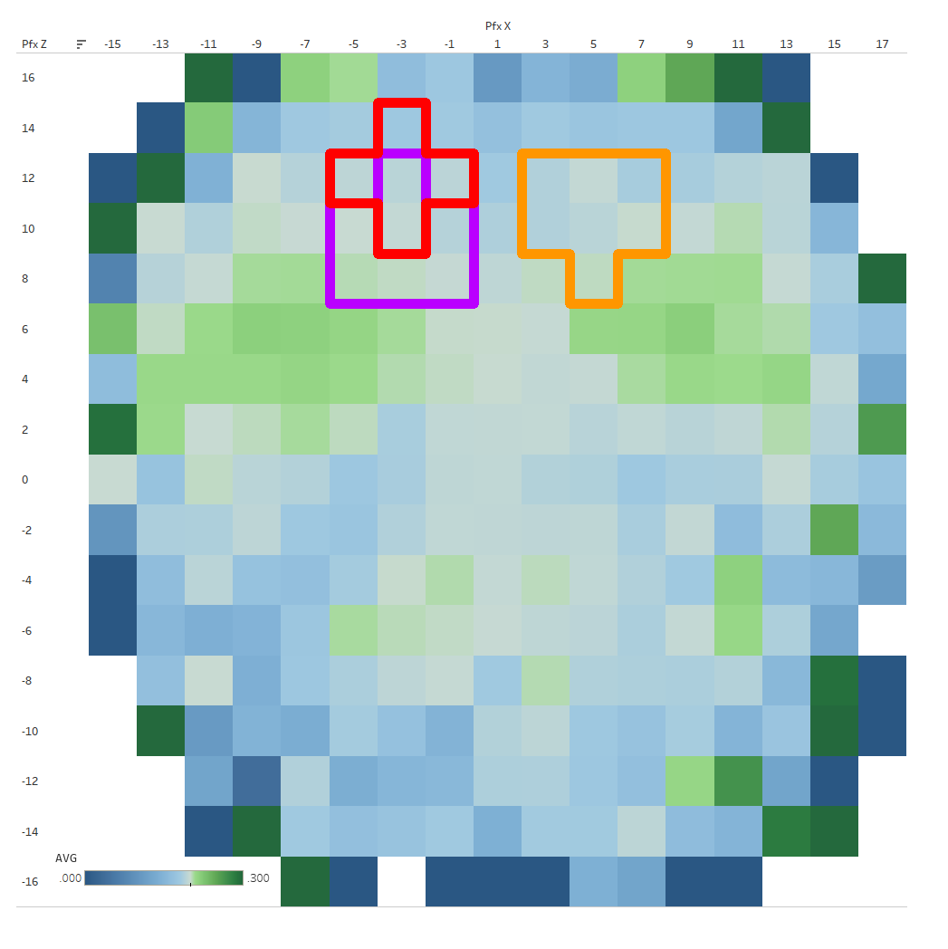 This chart looks a lot like a map, with the blue area’s looking like sea and the green like land. That wide blue area in the middle is the Sea of Fastballs, as you may notice going forward.