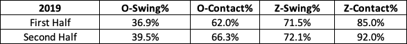 Although his aggressiveness didn’t change much between these two time periods, Rosario did find more success in offering at pitches. When combined with better overall quality-of-contact numbers, it’s not surprising that he saw more success despite negative regression in other areas of his batted-ball profile.