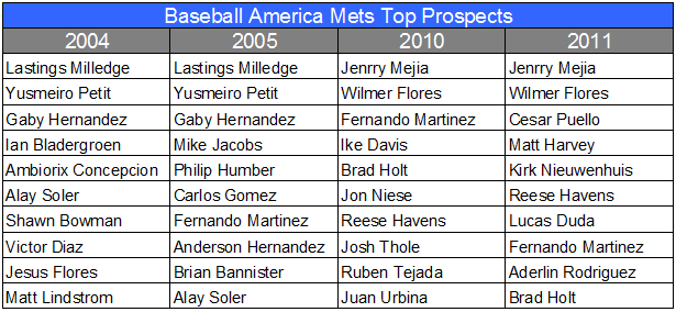 I decided to go to the ultimate authority on prospects and minor league systems, Baseball America to see what the Mets top prospects looked like in the periods 2004-2005 compared to 2010-2011. Take a look…
