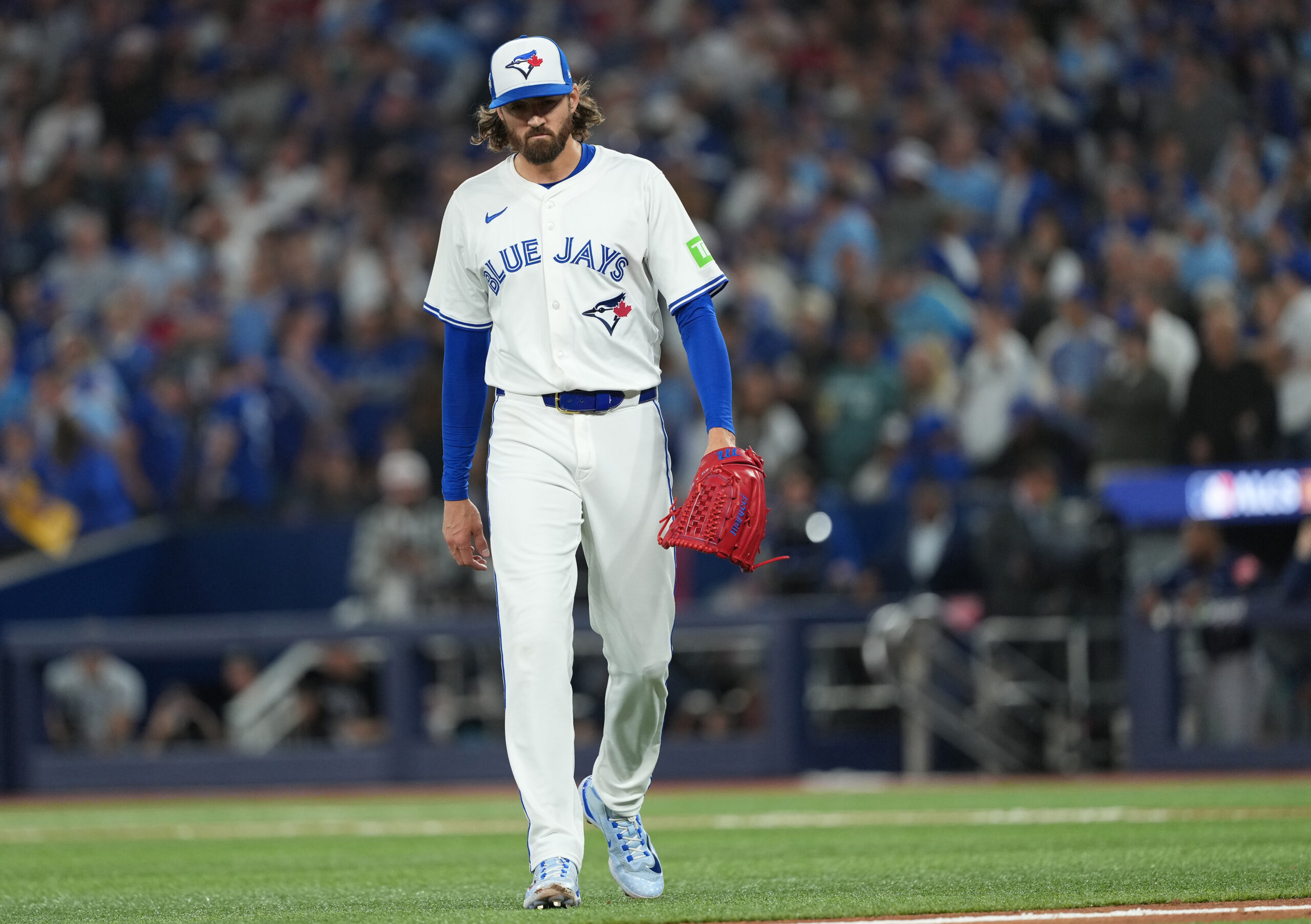 Oct 20, 2025; Toronto, Ontario, CAN; Toronto Blue Jays pitcher Kevin Gausman (34) walks to the dugout after the seventh inning against the Seattle Mariners during game seven of the ALCS round for the 2025 MLB playoffs at Rogers Centre. Mandatory Credit: Nick Turchiaro-Imagn Images